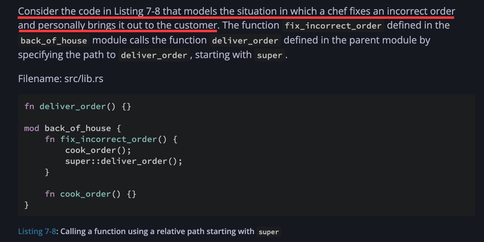同样在 7.2 中,作者引入了一个餐馆的前厅和后厨的示例来说明 scope and privacy,乍一看似乎没什么问题,但如果将目光转向 7.3 就会发现,后面的例子全是围绕着一个抽象的餐厅来进行,其中的一些需求的来源无从得知。对我来说,要是抛开这里的情景,直接读代码的结构,反而更好理解。