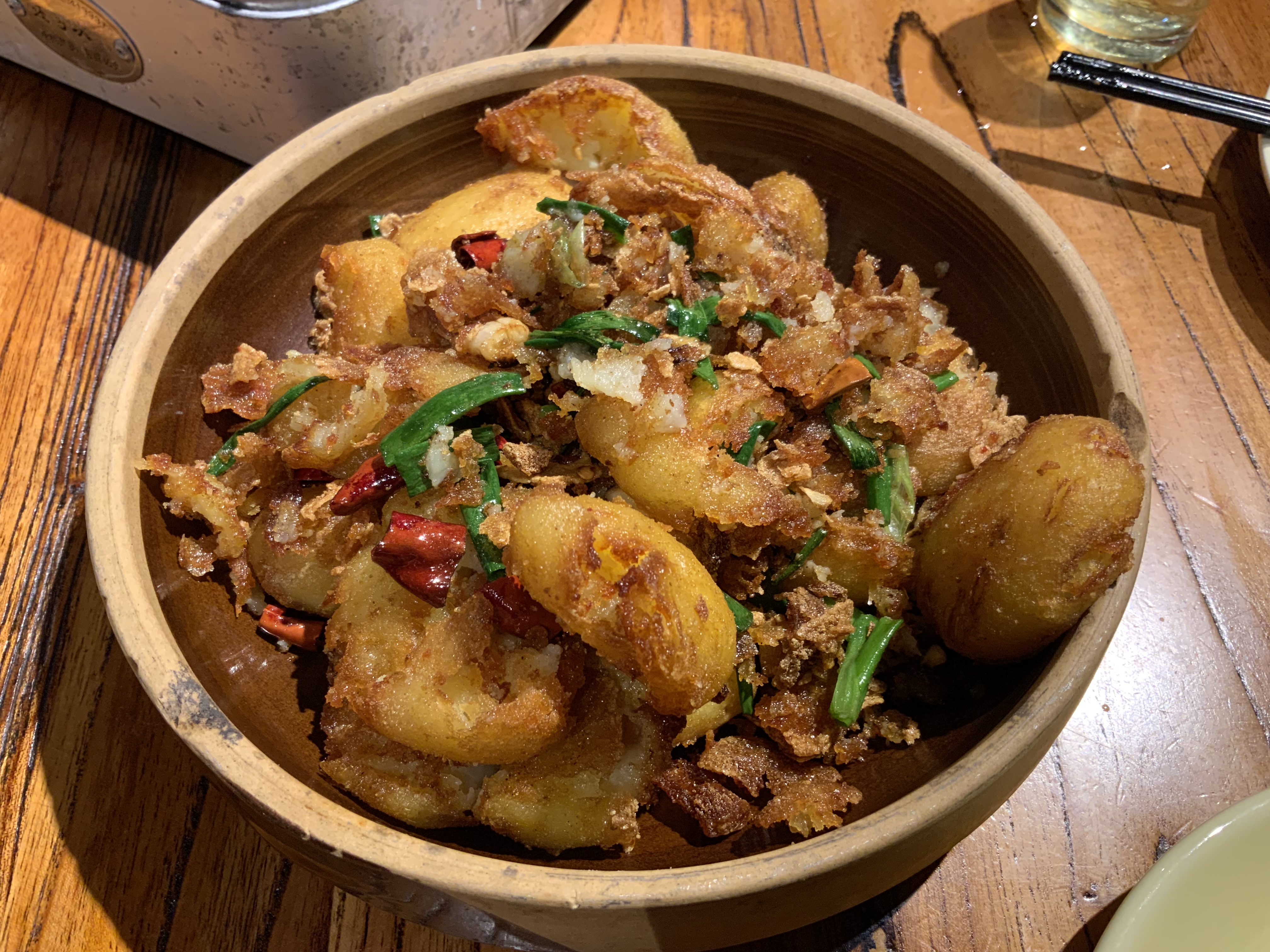 之前好像从来没有吃过这种形式的火锅,比较新奇的是贴在锅上的这些软饼(不是土豆),好像来自北方?拍的时候已经晚了,上面的软饼已经被吃了几个了。不过好像正宗的火锅里,软饼要放下去一起炖?还是我们不会吃。刚开始我们都觉得这些软饼挺普通的,后来快要吃完了这些饼也没吃多少,被炖了一会以后变更软、入味了,果然。